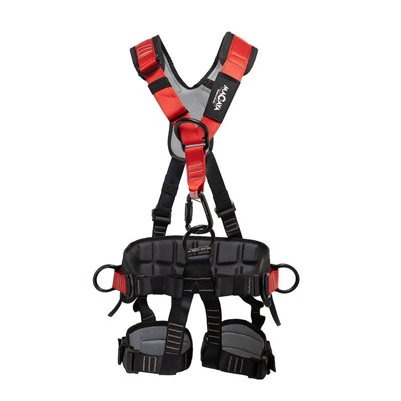 Los profesionales de limpieza de vidrios permanecen suspendidos durante períodos prolongados, por lo que el arnés debe ofrecer comodidad ergonómica sin sacrificar la seguridad. Los modelos con 4 o 5 argollas son los más recomendados, ya que permiten la conexión simultánea a sistemas de descenso controlado y dispositivos anticaídas. La argolla frontal resulta indispensable para descendedores, mientras que las laterales facilitan el posicionamiento.
